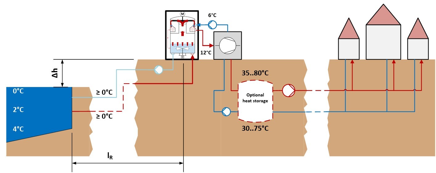 AQVA-HEAT III zielt darauf ab, am Beispiel einer regionalen Versorgungsinfrastruktur der Oberlausitz eine ganzjährige Wärmeversorgung aus Oberflächengewässern zu realisieren. Dazu hat das Projektteam ein integriertes System entwickelt, das Gewässer als Wärmequelle nutzt. Durch die Direktverdampfung in einem Vakuum-Flüssigeis-Erzeuger (VFE) des je nach Jahreszeit bis zu 0° Celsius kalten Wassers, kann die Anlage ganzjährig betrieben werden. Weitere Vorteile sind das natürliche, ungiftige, nicht brennbare und preiswerte Kältemittel Wasser, welches durch seine hohe Energiedichte auch kleinere Gewässer erschließen kann als Wärmepumpenanlagen, die derzeit am Markt sind. Die resultierende Temperatur nach dem VFE liegt konstant bei mindestens 12° Celsius. Eine klassische zweistufige Wärmepumpe hebt das Temperaturniveau im Anschluss auf bis zu 90° Celsius, um die Wärme ins Fernwärmenetz der Stadtwerke Zittau einzuspeisen. Diese Form der Wärmequellenerschließung bietet Potenziale für Planbarkeit, Versorgungssicherheit und Netzintegration und lässt sich von rund 100 kW (thermisch) bis in Megawattbereiche skalieren, wobei die genutzte Flusswassermenge und die eingesetzte Strommenge vergleichsweise gering bleiben.
